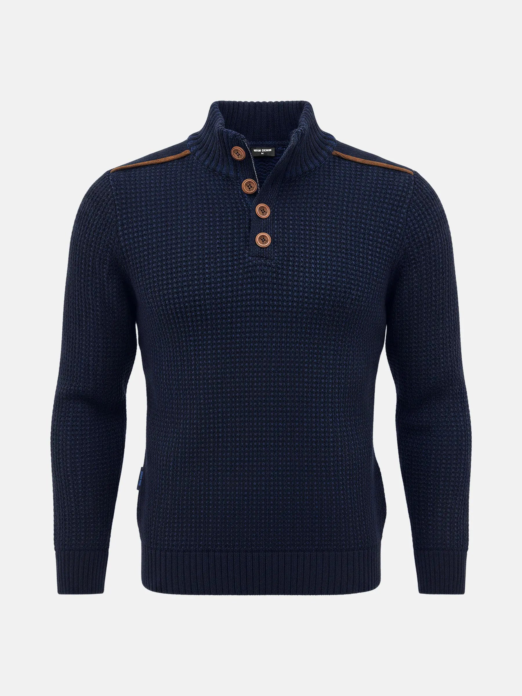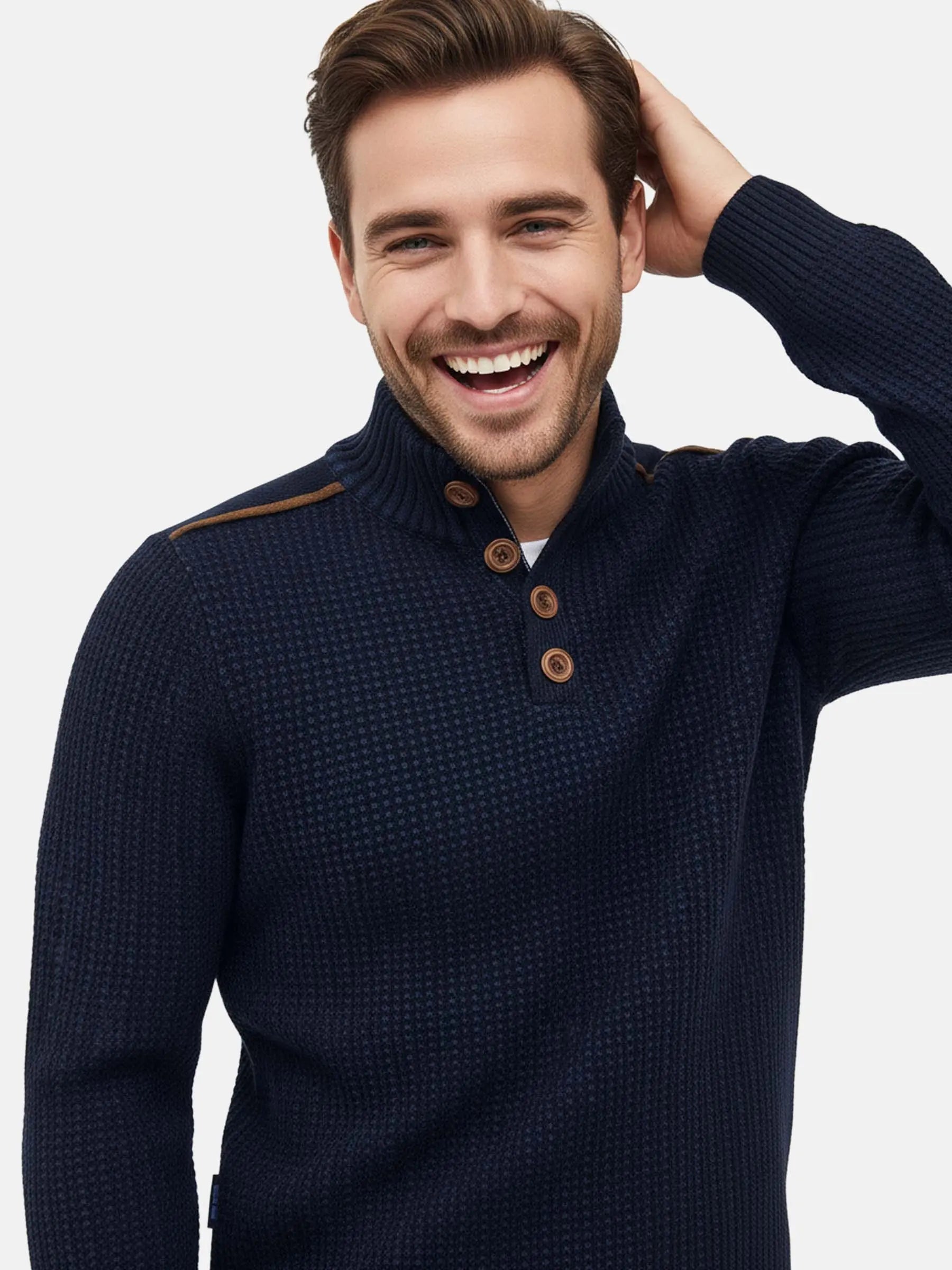 The Tenzor Indigo Navy Knitwear brings together rich winter texture and timeless masculine style. Its structured waffle-knit design adds depth while keeping the sweater warm yet breathable. The high buttoned collar enhances comfort and gives the piece a refined, rugged character that works effortlessly for both casual and smart outfits.
